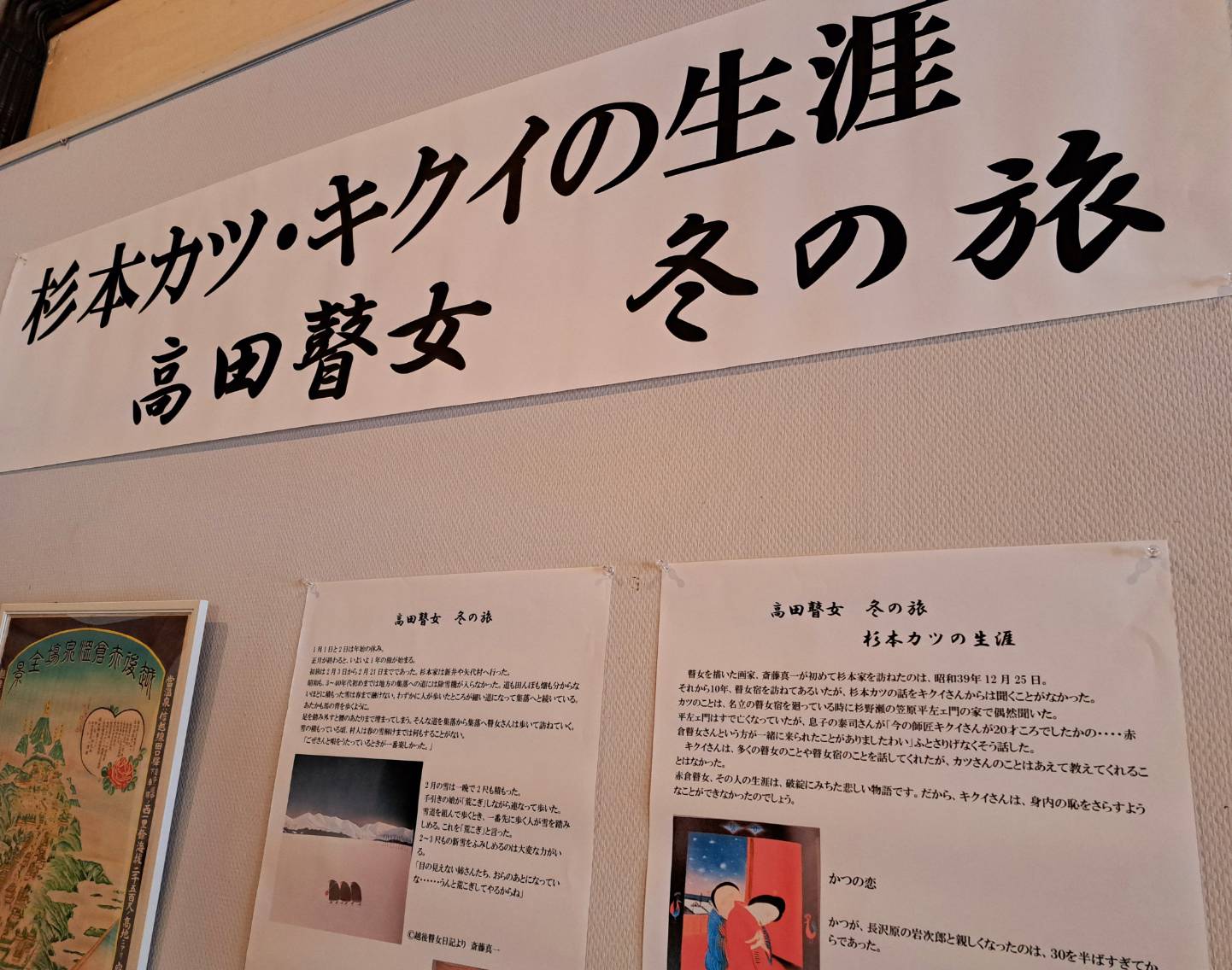 高田瞽女の杉本カツ・キクイの二人の瞽女が3月に冥土に旅立った事を偲んでの作品も一足早く展示をしております。