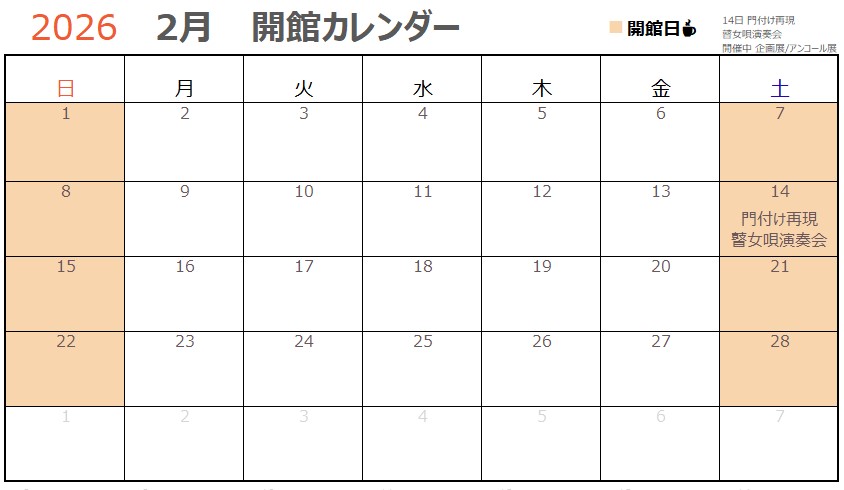 31 1月 2026 2月の開館カレンダー by 吉田 | posted in: 開館カレンダー | 0 明日から2月ですね。2月の開館日をお知らせいたします。14日は「高田瞽女、ふたたび」として瞽女の門付け再現と瞽女唄演奏会(満席:当日10席のみ)が開催されます。高田は現在積雪があります。お足元にご注意してお出かけください。
