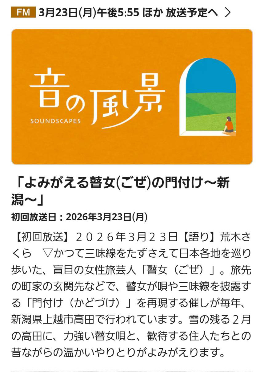 そんな「音の風景」、このたび2月に行われた瞽女の門付け再現の模様が全国放送されます。