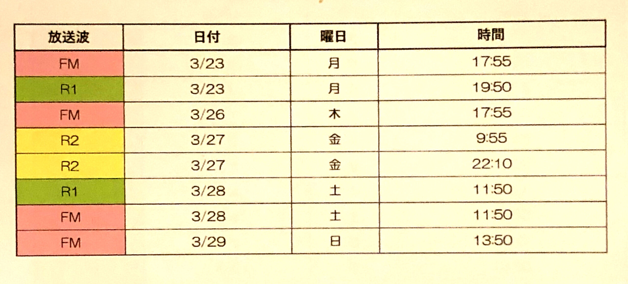 放送時間 (R1=NHK第1 / R2=NHK第2 / FM=NHK-FM)
