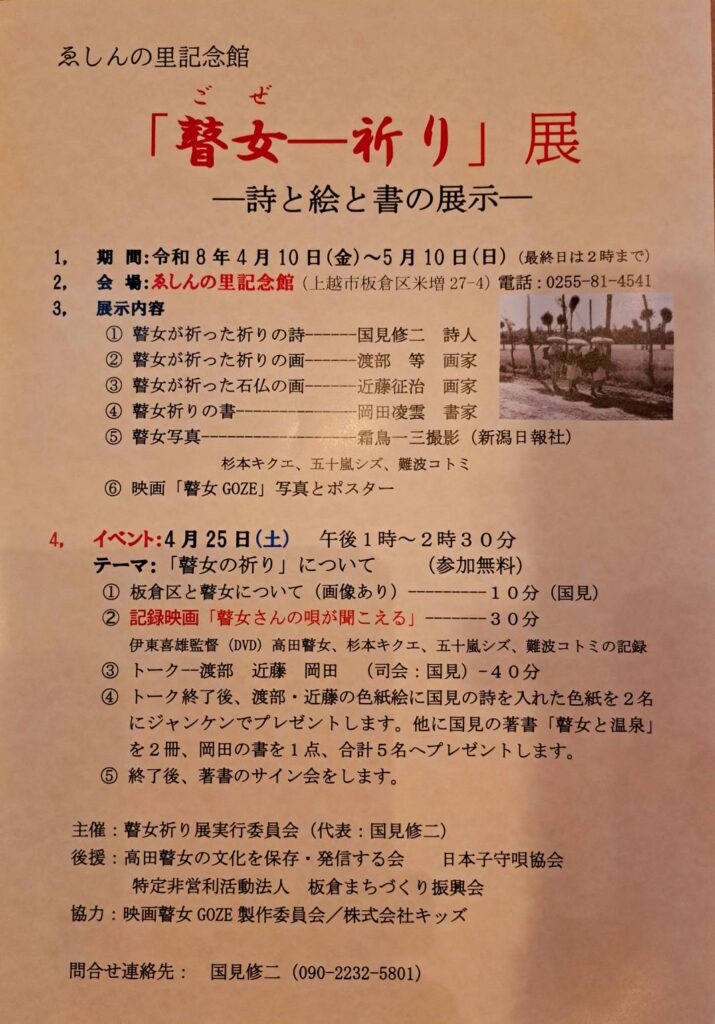 詩人・国見修二、そして2人の画家・渡部等と近藤征治、書家・岡田凌雲の4人が瞽女をテーマとした「瞽女-祈り」展を上越市板倉区「ゑしんの里記念館」で開催いたします。