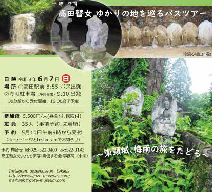 NPO法人高田瞽女の文化を保存・発信する会では今年も「高田瞽女ゆかりの地を巡るバスツアー」を開催いたします。